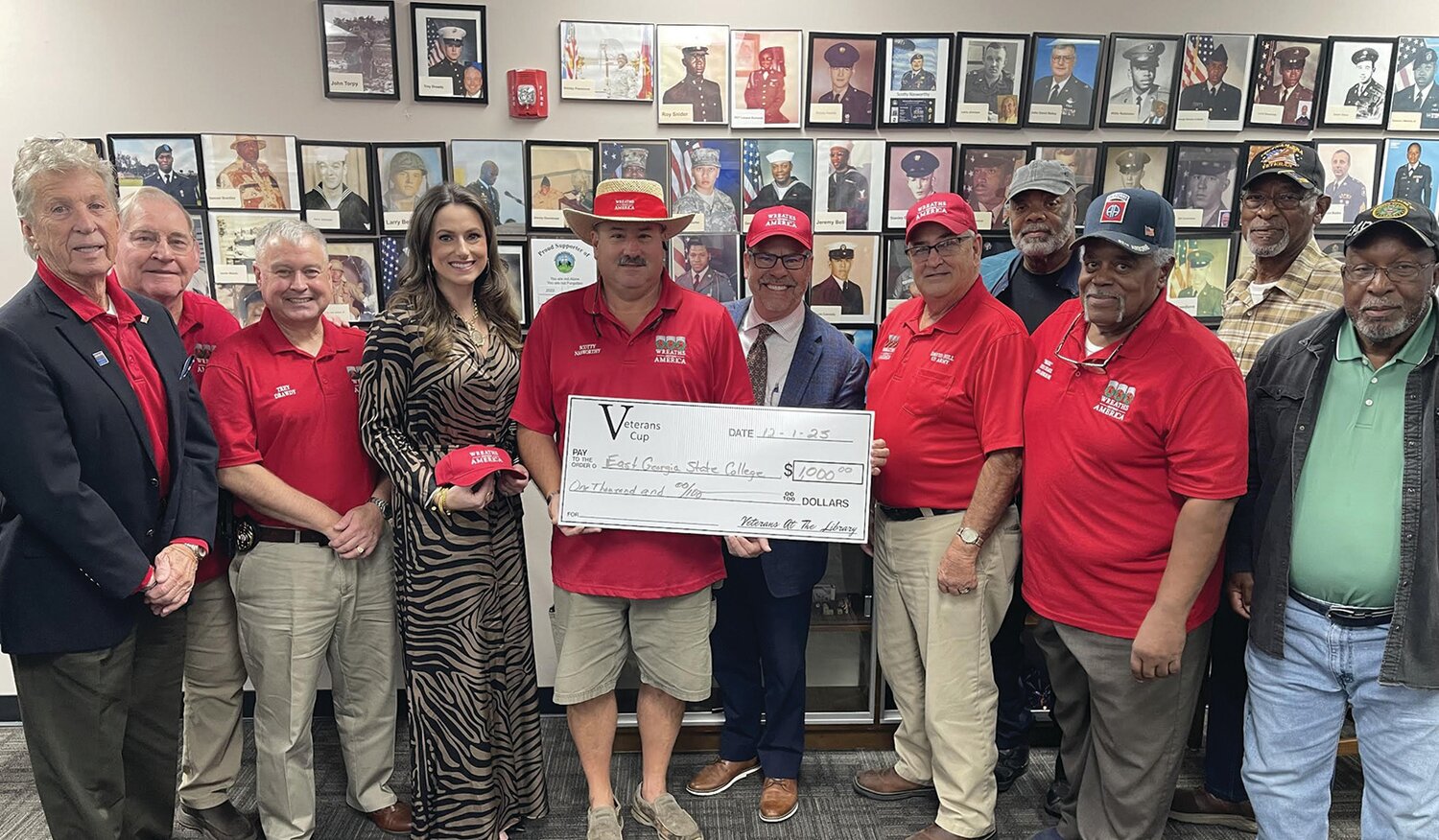 The Veterans at the Library held their weekly meeting at the Library Monday morning, December 1, at 9 a.m. With Chair Johnny Tapley presiding, they had 46 in attendance. Shari Watt provided a breakfast casserole, grits, donuts, orange juice, cranberry juice, grape juice, apple juice and coffee. Chair Johnny introduced Veteran Trey Drawdy who then introduced the Georgia Southern University President Kyle Marrero. President Marrero talked about the transition of East Georgia State College to Georgia Southern University, to be called Georgia Southern University – East Georgia Swainsboro, as of January 1, 2026. East Georgia has over 3,000 students this year and is looking to increase in students the coming years. The Veterans then presented Dr. Marrero a check for $1,000.00 for East Georgia State College Scholarship program from the Veterans Cup Golf Tournament. Dr. Marrero then introduced Harley Smith who is the VP Institutional Advancement director and she answered several questions. Veteran Dess Smith III also took up each City Cemetery section list for wreaths. On December 13, at 11 a.m., Veterans at the Library will place wreaths on every veteran’s grave in the City Cemetery after their annual WAA event with the help of the citizens of Emanuel County.